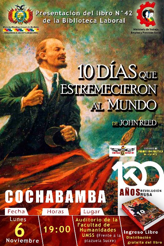 El Ministerio de Trabajo, Empleo y Previsión Social , la Escuela de Formación Política de Jóvenes y el colectivo “Comunidad y Revolución” invitan a su distinguida autoridad a participar en la presentación del libro “ 10 DÍAS QUE ESTREMECIERON EL MUNDO” de Jhon Reed en homenaje a los100 Años de la Revolución Rusa a realizarse el día lunes 6 de noviembre a Hrs. 19:00 en el Auditorio de la Facultad de Humanidades – UMSS ( Plazuela Sucre, Edificio nuevo, 4to. Piso )